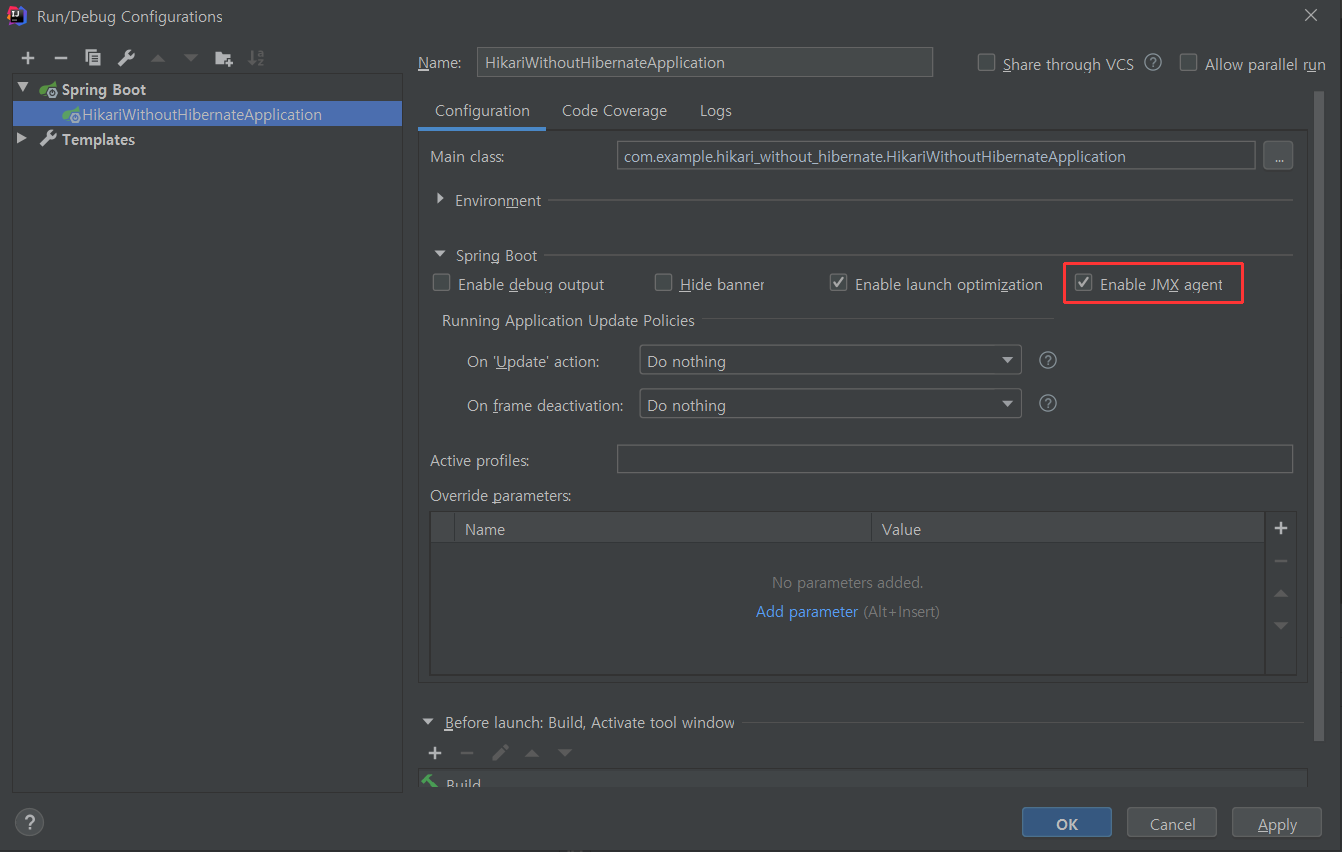 Run > Edit Configuration에서 Enable JMX agent를 해제시켜 줍니다.